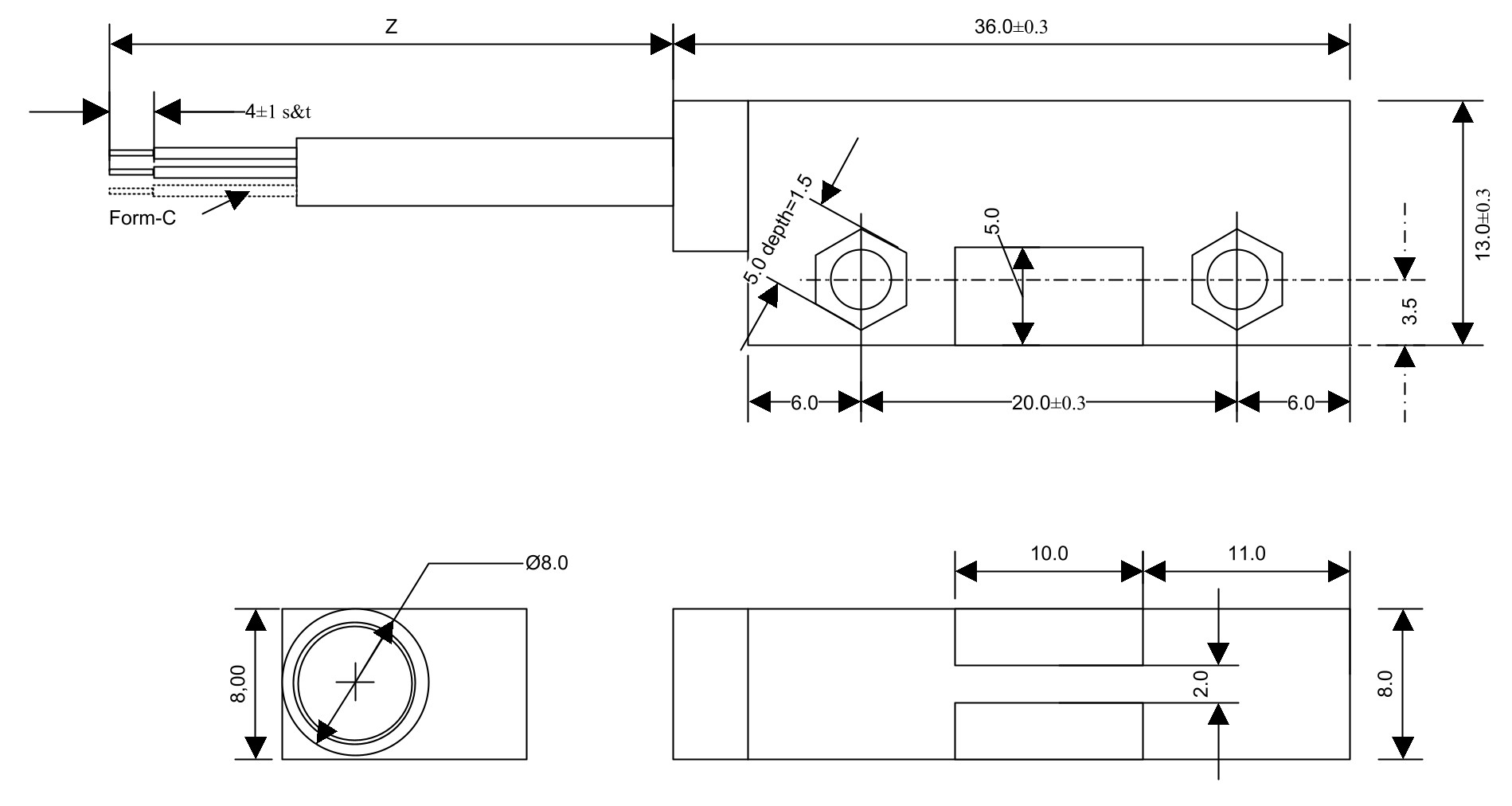 Das Gehäuse eignet sich für Schraub- oder Klebemontage und ist mit verschiedenen Kabellängen, Empfindlichkeiten und Steckern erhältlich.